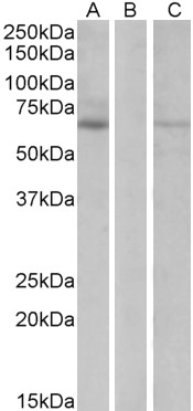 Western Blot In transfected HEK293 transiently expressing full-length Human MKRN1 (myc and DYKDDDDK tagged), a band of approx. 60kDa was observed. No bands were observed in mock-transfected HEK293 and the same band was observed using anti-DYKDDDDK tag a