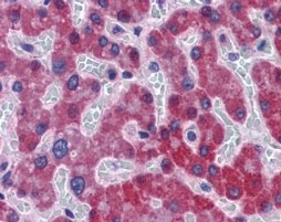 Immunohistochemistry In paraffin embedded Human Liver shows textured cytoplam staining in hepatocytes. Recommended concentration, 5-10µg/ml.