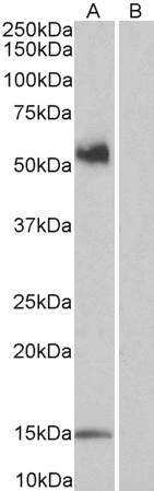 | Western Blot | Approx 55kDa band observed in Human Lymph Node lysates (calculated MW of 40.1kDa according to NP_000582.1). The observed molecular weight corresponds to earlier findings in literature with different antibodies (Funda et al, Infect Immun. 20 |