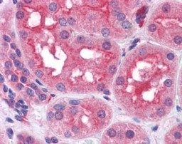 Immunohistochemistry In paraffin embedded Human Kidney shows distinct staining patterns in the cytoplam of PCT. Recommended concentration, 3-6µg/ml.
