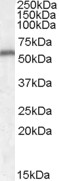 Western Blot Approx 55kDa band observed in Human Brain (Cerebellum) lysates (calculated MW of 22.4kDa according to NP_006170.1). The observed molecular weight corresponds to earlier findings in literature with different antibodies (Ghinelli et al, Inve