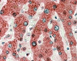 Immunohistochemistry In paraffin embedded Human Liver shows a granular pattern in the cytoplasm of hepatocytes. Recommended concentration, 5-10µg/ml.