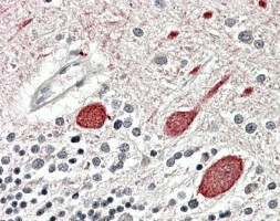 Immunohistochemistry In paraffin embedded Human Cerebellum shows membranous staining primarily in Purkinje cells. Recommended concentration, 3-6µg/ml.