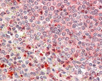Immunohistochemistry In paraffin embedded Spleen shows various types of subnuclear staining in select splenocytes and additional membrane plus cytoplasm staining elsewhere. Recommended concentration, 5-10µg/ml.