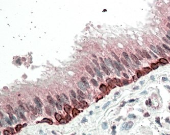 Immunohistochemistry In paraffin embedded Human Bronchus shows strong nuclear staining in the basal cells of the resporatory epithelium. Recommended concentration