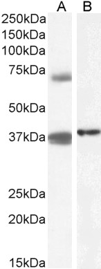 Western Blot Approx 37kDa band observed in Human Peripheral Blood Mononucleocytes (PBM) and in lysates of cell lines HeLa. An additional 70kDa band was seen in some PBM lysates (calculated MW of 37.3kDa according to NP_001317311.1 (isoform 2) and 65.8