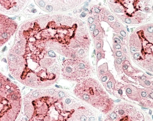 Immunohistochemistry In paraffin embedded Human Kidney shows staining of the brush borders in the proximal convoluted tubules. Recommended concentration, 5-10µg/ml.
