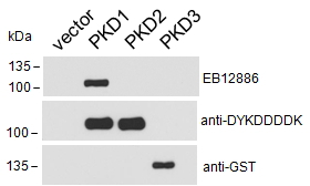 Western Blot In transfected HEK293 transiently expressing Human PKD1 (DYKDDDDK tagged), a band of approx. 100kDa is observed. The same band is observed using anti- DYKDDDDK antibody and no bands are observed in cells transiently expressing Human PKD2 or