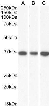 Western Blot Approx 36-37kDa band observed in lysates of cell lines HeLa, HepG2 and K562, and approx 35kDa band observed in Human Heart and Liver lysates (calculated MW of 35.5kDa according to NP_005909.2). Recommended concentration