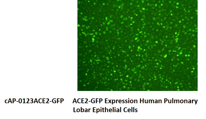 | Huma Pulmonary Lobar Bronchial Epithelial Cells (HPuLBEPCs, cAP-0123) cells were isolated from normal human lung Lobar Bronchial tissue. ACE2-GFP Expressing Human Pulmonary Lobar Bronchial Epithelial Cells were selected from puromycin resistant HPuLBEPCs after infected with lentivirses expressing ACE2-GFP. The cells are shipped in frozen vials (the cells are provided @ passage 3). Human Airway Epithelial Growth Medium (HAEPGM, composed of Airway Epithelial Cell Basal Medium (ATCC Cat NO PCS-300-030) and Bronchial Epithelial Cell Growth Kit (ATCC CAT NO PCS-300-040) is recommended for cell culture and these cells have a minimum average population doubling levels > 8 when cultured following the detailed protocol described below). |