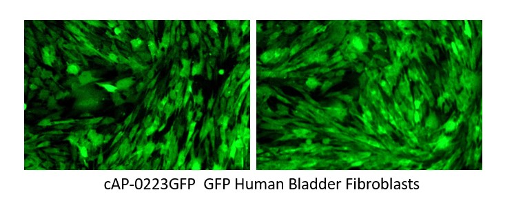 | Human Bladder Fibroblasts was derived from a healthy Human Bladder tissue, and GFP-Human Bladder Fibroblasts were selected by puromycin after infection with GFP-lentvruses, and shipped in frozen vials (the cells are provided @ passage 3). Fibroblast Growth Medium (FGM) (cAP-44) is recommended for cell culture and these cells have an average minimum population doubling levels > at least 10 when cultured following the detailed protocol described below). Human uterine fibroblasts are tested negative for HIV-1, HBV, HCV, and mycoplasma. |