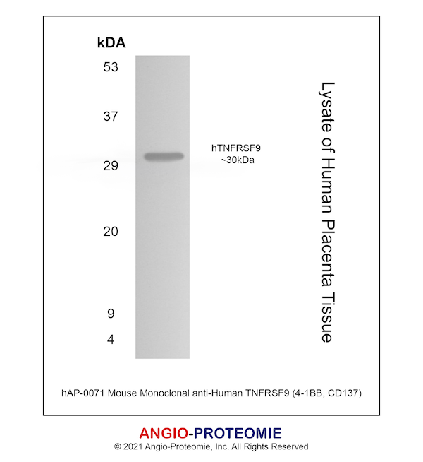 Preparation This antibody was produced from a hybridoma (mouse myeloma fused with spleen cells from a mouse immunized with human TNFRSF9 recombinant protein (extracellular domain)