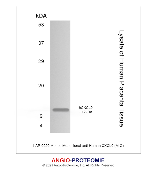 Preparation This antibody was produced from a hybridoma (mouse myeloma fused with spleen cells from a mouse immunized with human recombinant CXCL9 (also called MIG)
