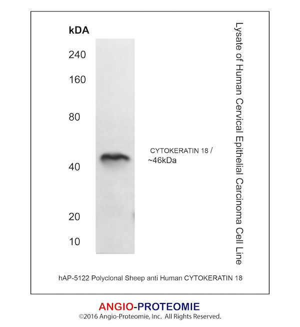 Preparation This antibody was produced from a sheep immunized with purified human CYTOKERATIN 18 protein.