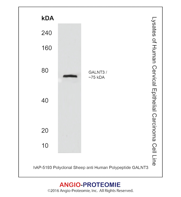 Preparation This antibody was produced from a sheep immunized with purified human Polypeptide GalNac Transferase 3/GALNT3 protein.