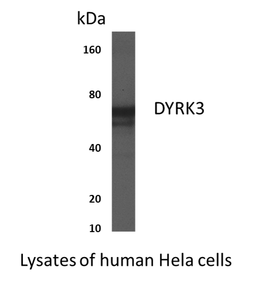 Preparation This antibody was produced from a hybridoma (mouse myeloma fused with spleen cells) from a mouse immunized with recombinant human DYRK3 (Dual-specificity tyrosine [Y] phosphorylation regulated kinase 3). DYRK3 is also called REDK and is a 70-72kDa member of the MNB/DYRK subfamily, CMGC Ser/Thr protein kinase family of enzymes.